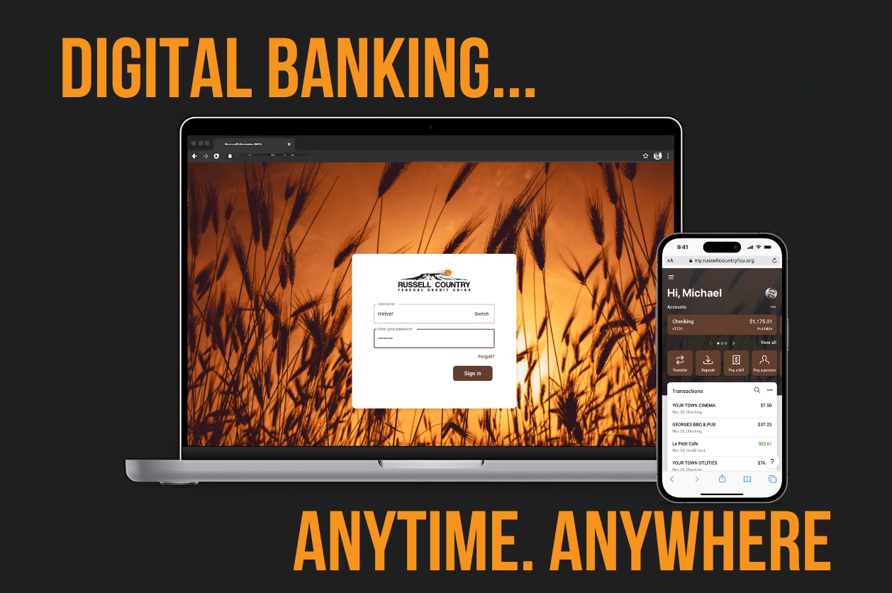 With Russell Country’s Digital Banking available on both our website and mobile app you have secure 24/7 access to your accounts and a full suite of convenient tools to manage your finances on your schedule.